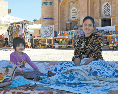 希瓦古城廣場上的手工藝人扎米拉(右)和孩子。