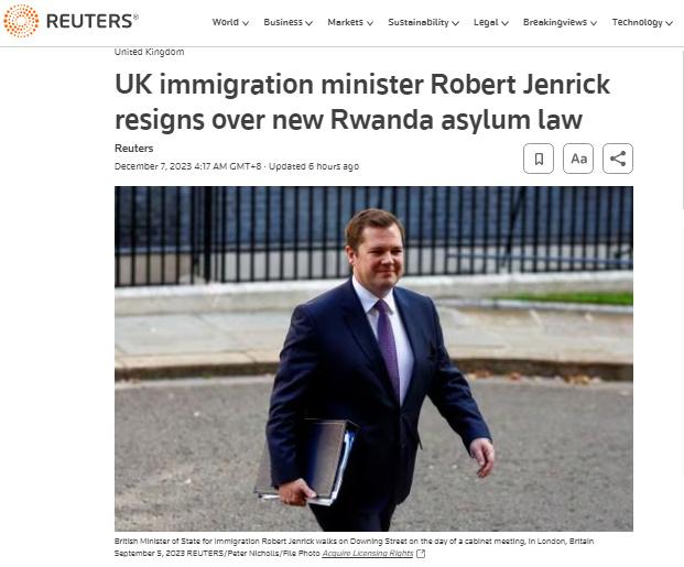 報(bào)道稱,詹里克對英國政府當(dāng)日公布的“盧旺達(dá)安全(庇護(hù)和移民)法案草案”持有不同意見。他在一封辭職信中表示,該立法是在2024年英國大選之前解決移民危機(jī)的“最后機(jī)會之一”。