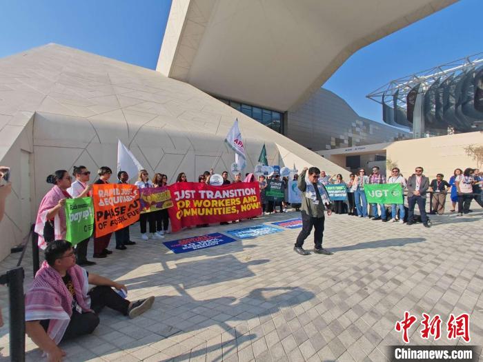 12月9日,阿聯(lián)酋迪拜,抗議者在聯(lián)合國氣候變化迪拜大會藍區(qū)會場集會并呼吁公正轉(zhuǎn)型?!≈行律缬浾?龐無忌 攝