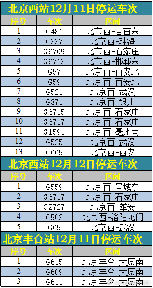 中新網(wǎng)12月11日電 據(jù)北京西站官方微博消息,受降雪影響,12月11日、12月12日北京西站、北京豐臺(tái)站部分列車停運(yùn),已購買停運(yùn)列車車票的旅客,可于30日內(nèi)辦理全額退票手續(xù)。請廣大旅客合理安排出行,關(guān)注鐵路部門公告。
