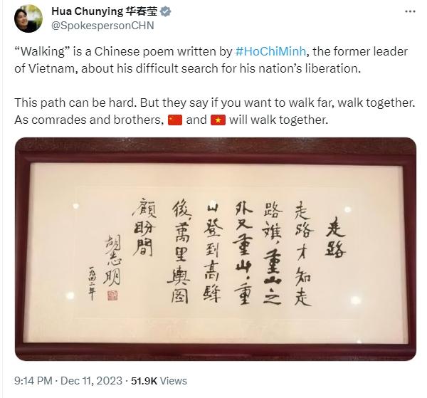 華春瑩寫道,“《走路》是越南老一輩領導人胡志明所寫的一首漢語詩,講述了他爭取國家解放的艱難歷程。這條路可能很艱難。但人們說,如果想走得遠,就要一起走。作為同志和兄弟,中國和越南將一路同行。”