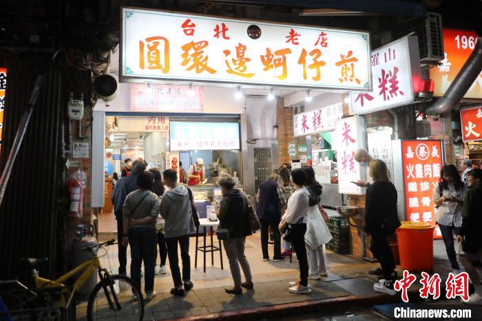 近日,臺北寧夏夜市里的圓環(huán)邊蚵仔煎店,顧客在門口排隊(duì)?!≈行律缬浾?陳小愿 攝