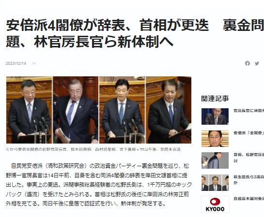 據(jù)報(bào)道,日本內(nèi)閣官房長(zhǎng)官松野博一在首相官邸向媒體表示,14日已提交辭呈。同日早些時(shí)候,經(jīng)濟(jì)產(chǎn)業(yè)大臣西村康稔、農(nóng)林水產(chǎn)大臣宮下一郎、總務(wù)大臣鈴木淳司均已遞交辭呈。