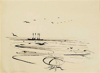在人物肖像之外,萬徒勒里也熱衷于描繪中國山水。他于1954年創(chuàng)作的《長江》借鑒了中國水墨丹青技法,整幅畫作視野開闊,體現(xiàn)出中國水墨畫的朦朧、婉約與詩意。他在客居瑞士期間的畫作同樣展現(xiàn)中國水墨畫開闊的構(gòu)圖、精巧的線條和獨具一格的東方美學(xué)。畫作《歸來》通過南飛的歸雁、孤寥的漁船和茫茫無盡的海面,讓觀者感受到一種難以訴諸語言、始終縈繞心頭的鄉(xiāng)愁。