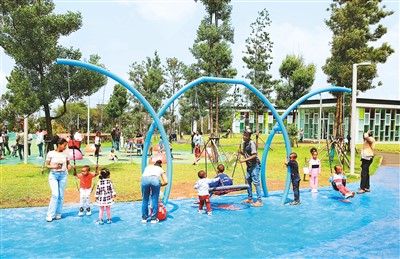 埃塞俄比亞首都亞的斯亞貝巴河岸綠色發(fā)展項(xiàng)目是由中國援助的工程,包括整治城市河道、在河道周邊修建公園和其他公共設(shè)施等。圖為當(dāng)?shù)睾⒆觽冊(cè)趤喌乃箒嗀惏秃影毒G色發(fā)展項(xiàng)目的兒童樂園玩耍。