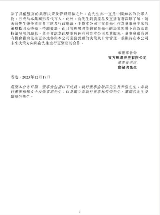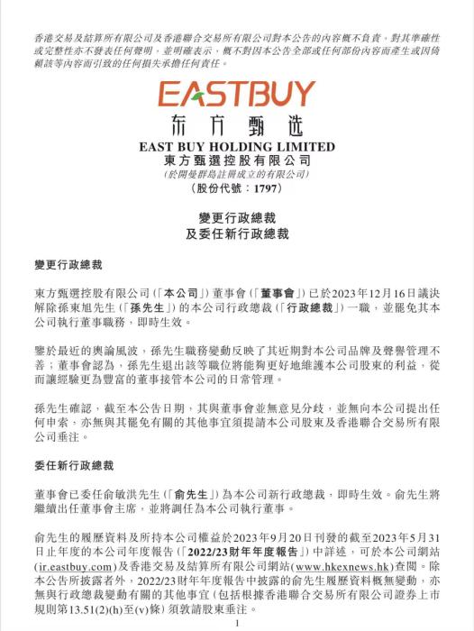 中新網(wǎng)12月18日電 12月18日,東方甄選開(kāi)盤后股價(jià)大漲,截至發(fā)稿時(shí),漲超10%。當(dāng)日凌晨,東方甄選微博賬號(hào)發(fā)布的直播預(yù)告海報(bào)顯示,董宇輝的身份已成為“東方甄選高級(jí)合伙人”。12月17日,東方甄選發(fā)布公告稱,董事會(huì)已于12月16日議決解除孫東旭的行政總裁一職,并罷免其公司執(zhí)行董事職務(wù),即時(shí)生效。(中新財(cái)經(jīng))