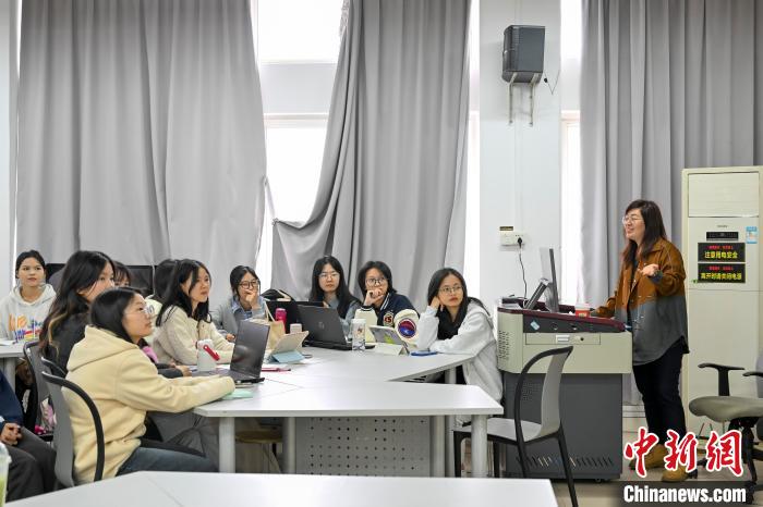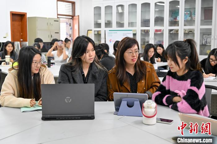近日,謝雅卉(右一)與同學(xué)們在課堂上討論廣告設(shè)計(jì)內(nèi)容。中新社記者 陳驥旻 攝