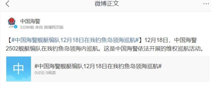 中新網(wǎng)12月18日電 據(jù)中國(guó)海警官方微博消息,12月18日,中國(guó)海警2502艦艇編隊(duì)在我釣魚島領(lǐng)海內(nèi)巡航。這是中國(guó)海警依法開展的維權(quán)巡航活動(dòng)。