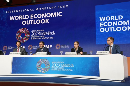 這是2023年10月10日在摩洛哥馬拉喀什拍攝的《世界經(jīng)濟(jì)展望報告》發(fā)布會現(xiàn)場。新華社記者霍晶攝