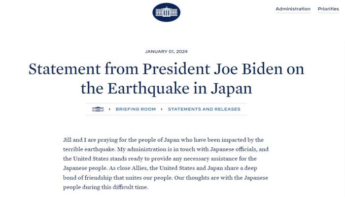 聲明稱(chēng),美國(guó)總統(tǒng)拜登和第一夫人吉爾“正在為遭受可怕地震影響的日本人民祈禱。拜登政府正與日本官員保持聯(lián)系,美國(guó)隨時(shí)準(zhǔn)備為日本民眾提供任何必要的援助?!?/p>