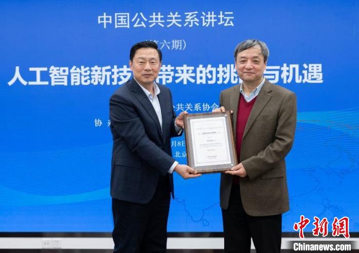 1月8日,中國(guó)公共關(guān)系講壇在北京舉行。圖為講壇結(jié)束后,中國(guó)公共關(guān)系協(xié)會(huì)會(huì)長(zhǎng)郭衛(wèi)民(左)向演講嘉賓、清華大學(xué)人工智能研究院常務(wù)副院長(zhǎng)孫茂松頒發(fā)榮譽(yù)證書(shū)?! ≈袊?guó)公共關(guān)系協(xié)會(huì)供圖。
