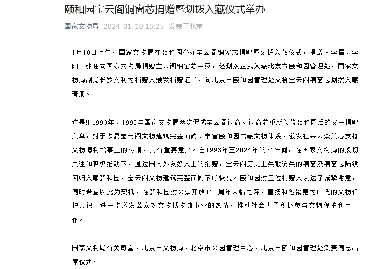 這是繼1993年、1995年國(guó)家文物局兩次促成寶云閣銅窗、銅窗芯重新入藏頤和園后的又一捐贈(zèng)義舉,對(duì)于恢復(fù)寶云閣文物建筑完整面貌、豐富頤和園館藏文物體系、激發(fā)社會(huì)公眾關(guān)心支持文物博物館事業(yè)的熱情,具有重要意義。自1993年至2024年的31年間,在國(guó)家文物局的殷切關(guān)注和積極推動(dòng)下,通過國(guó)內(nèi)外友好人士的捐贈(zèng),寶云閣歷史上失散流失的銅窗及銅窗芯陸續(xù)回歸入藏頤和園,寶云閣文物建筑完整面貌不斷恢復(fù)。頤和園對(duì)三位捐贈(zèng)人表達(dá)了誠(chéng)摯謝意,同時(shí)希望以此為契機(jī),在頤和園對(duì)公眾開放110周年來臨之際,宣揚(yáng)和凝聚更為廣泛的文物保護(hù)共識(shí),進(jìn)一步激發(fā)公眾對(duì)文物博物館事業(yè)的熱情,推動(dòng)社會(huì)力量積極參與文物保護(hù)利用工作。