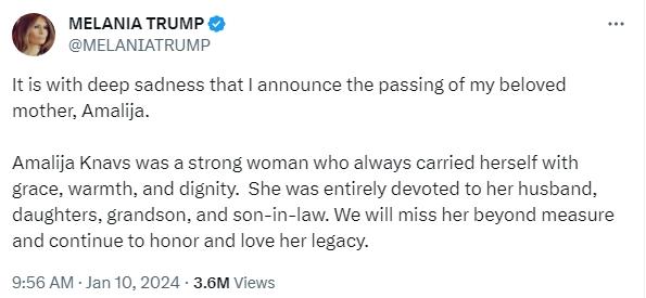 梅拉尼婭在X平臺(tái)上發(fā)文稱,“我懷著沉痛的心情宣布,我深愛(ài)的母親阿瑪利加去世了。阿瑪利加·納夫斯是一名堅(jiān)強(qiáng)的女性,她總是舉止優(yōu)雅、溫暖、莊重?!彼龑懙溃八钌畹貝?ài)著她的丈夫、女兒、外孫和女婿。我們會(huì)無(wú)比地懷念她,也會(huì)繼續(xù)尊重和愛(ài)戴她留下的寶貴財(cái)富?!?/p>