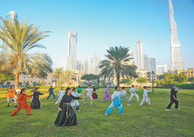 每到周末,世界最高建筑——阿聯(lián)酋迪拜哈利法塔附近的草坪上,一群身穿中式練功服的民眾排成隊(duì)列,伴著舒緩的中國古典民樂,起勢(shì)、野馬分鬃、白鶴亮翅……如今,越來越多民眾自發(fā)前來學(xué)習(xí)太極拳、太極劍、太極扇等,經(jīng)常性參加太極拳練習(xí)活動(dòng)的就有來自50多個(gè)國家和地區(qū)的近200人。