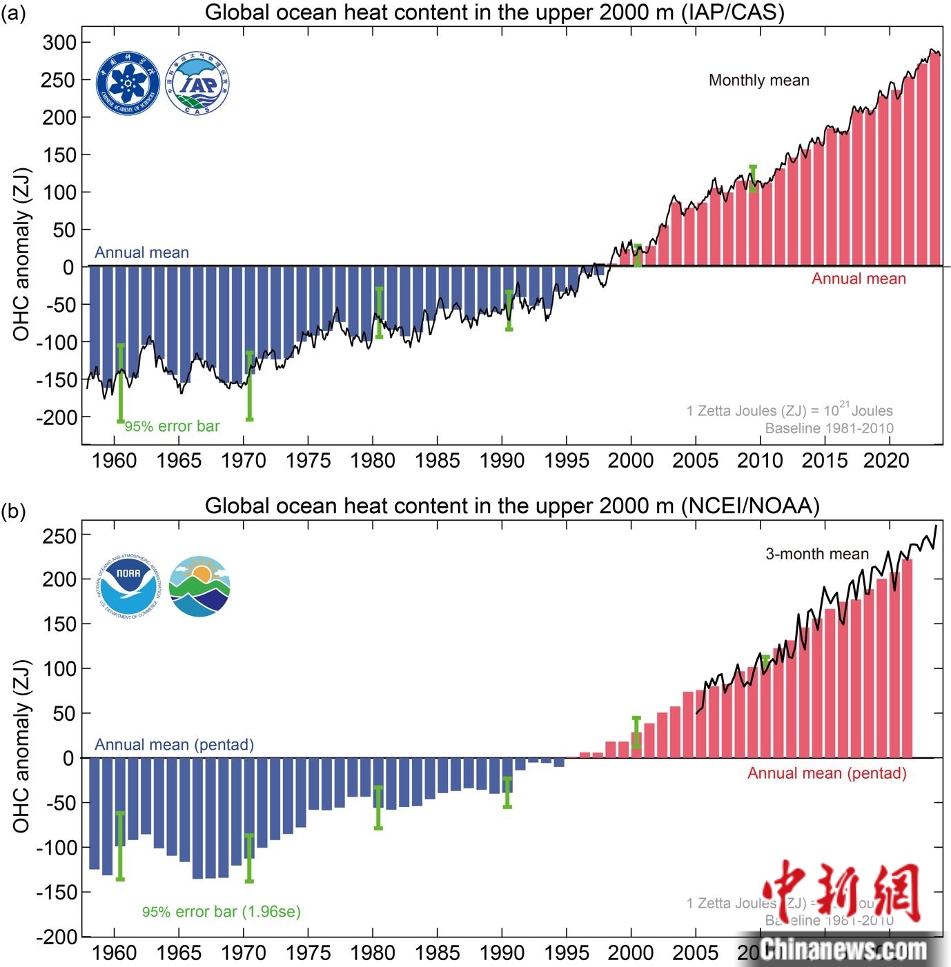1958-2023年全球海洋上層2000米熱含量變化時間序列:上圖為IAP/CAS數(shù)據(jù);下圖為NOAA/NCEI數(shù)據(jù)。中國科學(xué)院大氣物理研究所/供圖
