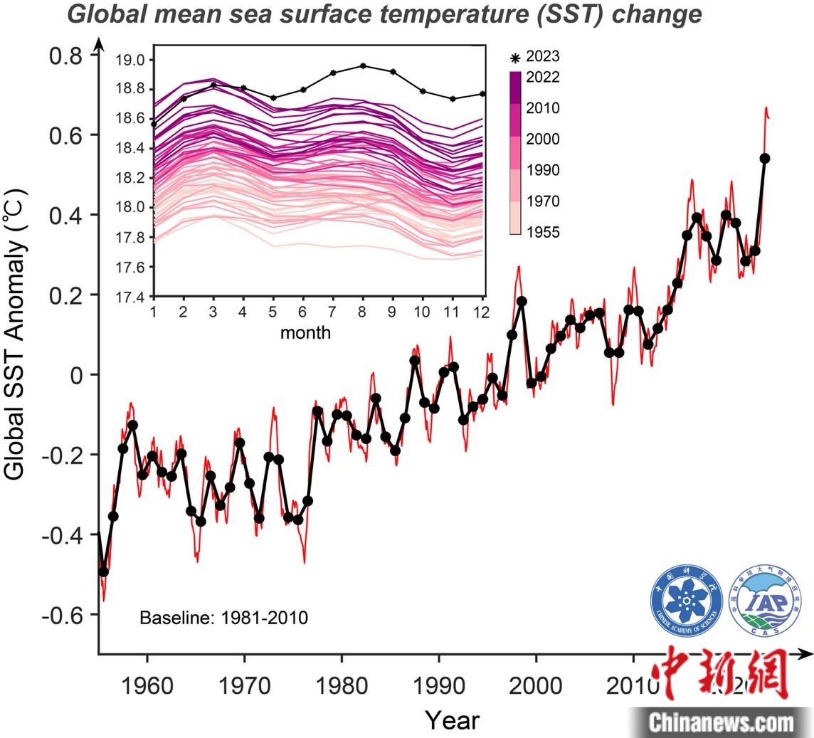 根據(jù)IAP/CAS溫度數(shù)據(jù)產(chǎn)品(1米層)分析的1955年至2023年12月全球平均海表溫度變化。黑線為年均值,紅色為月均值;異常值為相對于1981-2010年常年值;左上角內(nèi)框為海表溫度的季節(jié)變化。中國科學(xué)院大氣物理研究所/供圖