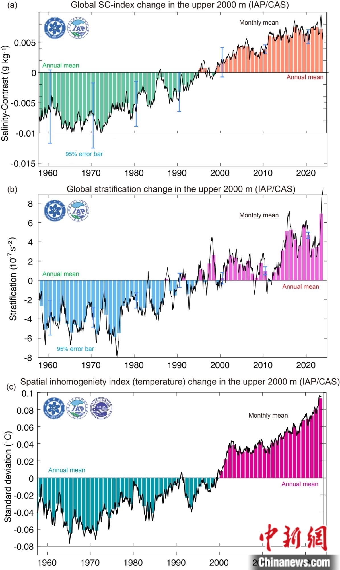 1958-2023年全球海洋上層2000米鹽度差指數(shù)SC(a)、層結(jié)(b)、溫度空間非均勻性指數(shù)(c)變化時間序列。黑色線條為月度變化,條狀色條為年變化。中國科學(xué)院大氣物理研究所/供圖