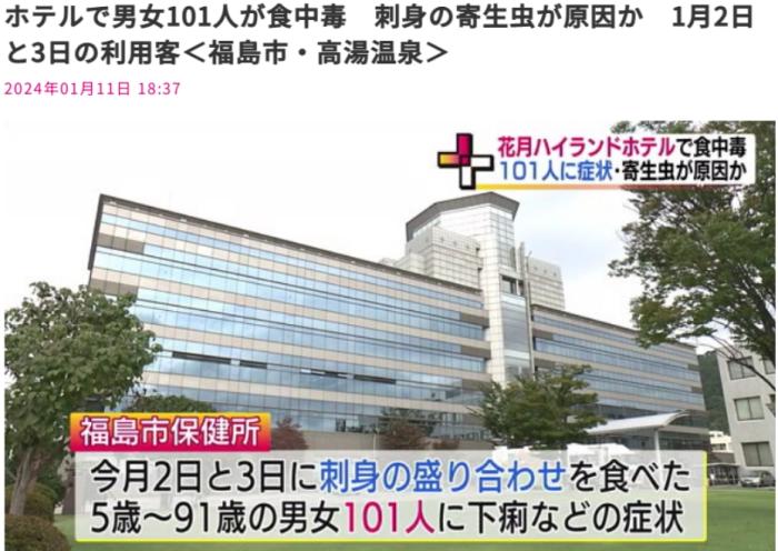 報道稱,中毒者年齡下至5歲,上至91歲。保健所在調(diào)查中發(fā)現(xiàn)該酒店提供的魚類刺身上檢測出寄生蟲,并認為這就是導致此次食物中毒的原因。
