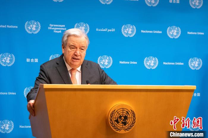 當(dāng)?shù)貢r(shí)間1月15日,聯(lián)合國(guó)秘書(shū)長(zhǎng)古特雷斯在紐約聯(lián)合國(guó)總部向媒體發(fā)表講話(huà),再次呼吁立即在加沙地帶實(shí)現(xiàn)人道主義?;??!≈行律缬浾?王帆 攝