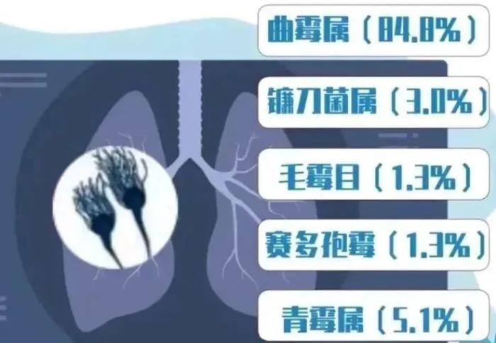 一項(xiàng)發(fā)表在《協(xié)和醫(yī)學(xué)雜志》上的我國霉菌感染流行病學(xué)分析的多中心回顧性研究顯示,以曲霉屬引起的感染占比最高為84.8%,其次是鐮刀菌屬、毛霉目和賽多孢霉等霉菌造成的感染,在霉菌引起的常見感染性疾病中以下呼吸道、耳部、眼部和皮膚感染較多見。