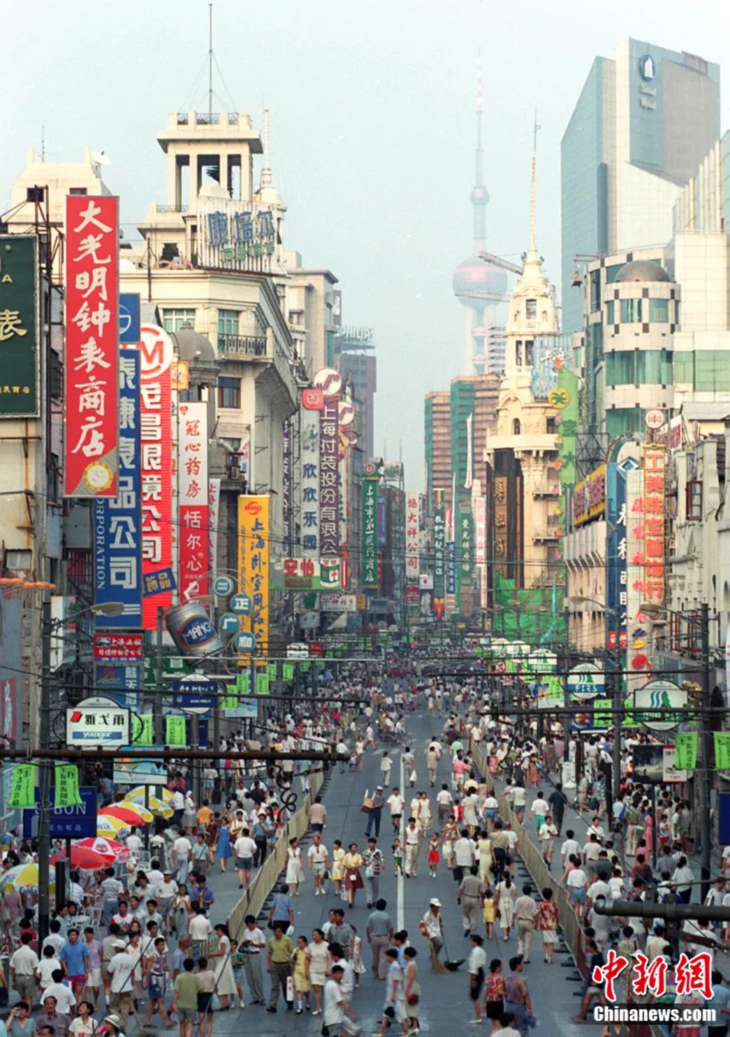 1995年,上海南京路步行街商家招牌林立,行人如織。陸濤 攝