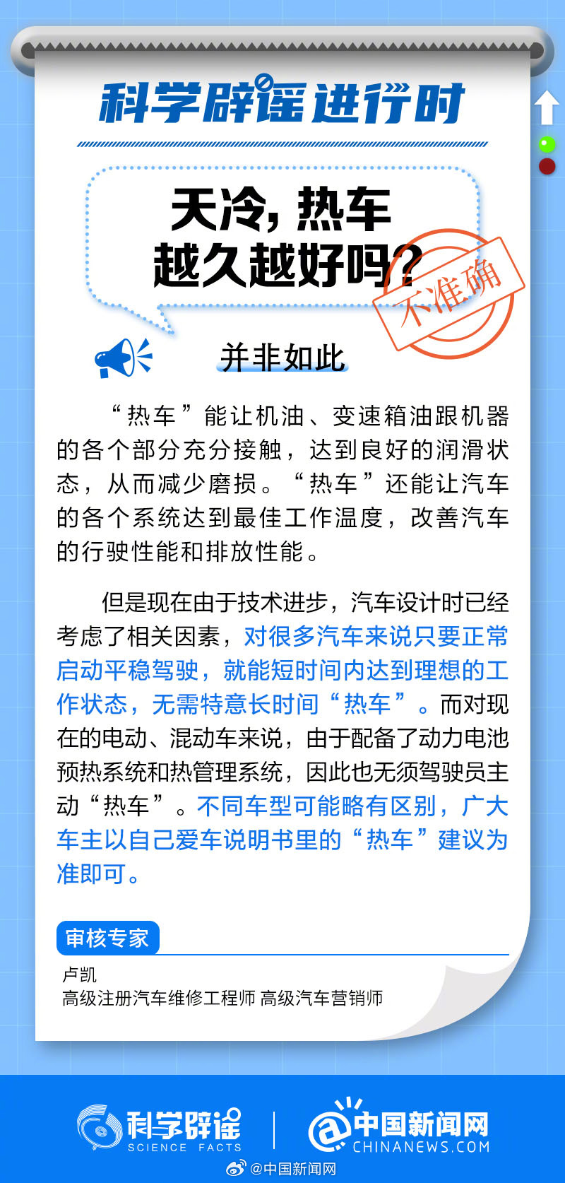 中新網(wǎng)1月23日電 “熱車”能讓機(jī)油、變速箱油跟機(jī)器的各個(gè)部分充分接觸,達(dá)到良好的潤(rùn)滑狀態(tài),從而減少磨損?!盁彳嚒边€能讓汽車的各個(gè)系統(tǒng)達(dá)到最佳工作溫度,改善汽車的行駛性能和排放性能。但是現(xiàn)在由于技術(shù)進(jìn)步,汽車設(shè)計(jì)時(shí)已經(jīng)考慮了相關(guān)因素,對(duì)很多汽車來說只要正常啟動(dòng)平穩(wěn)駕駛,就能短時(shí)間內(nèi)達(dá)到理想的工作狀態(tài),無需特意長(zhǎng)時(shí)間熱車。(來源:@科學(xué)辟謠 @中國新聞網(wǎng))