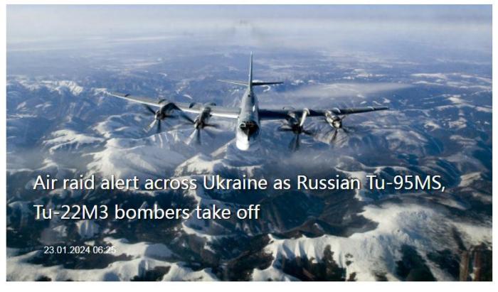 中新網(wǎng)1月23日電 據(jù)烏通社23日?qǐng)?bào)道,烏克蘭全境拉響防空警報(bào)。報(bào)道稱,烏克蘭空軍記錄到當(dāng)?shù)貢r(shí)間23日早些時(shí)候,多架圖-95轟炸機(jī)和圖-22轟炸機(jī)從俄羅斯起飛。