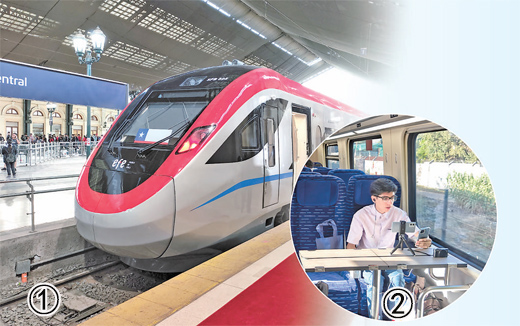 圖①:中企研制的電力內燃雙動力動車組列車停靠在智利圣地亞哥中央車站。