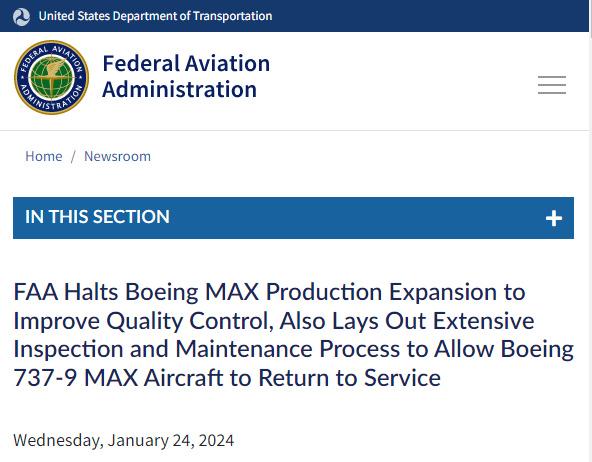 中新網(wǎng)1月25日電 當(dāng)?shù)貢r(shí)間1月24日,美國交通部發(fā)布公告稱,美國聯(lián)邦航空管理局(FAA)批準(zhǔn)了必須對(duì)每架停飛的波音737 MAX9型飛機(jī)執(zhí)行徹底的檢查和維護(hù)程序,檢查維護(hù)完成后這些飛機(jī)才有資格恢復(fù)運(yùn)營。