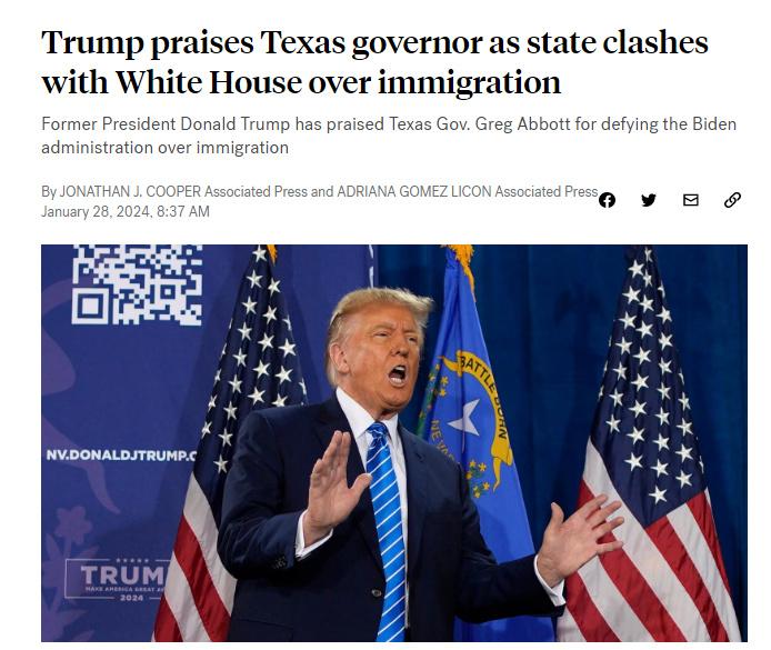 據報道,特朗普27日在一場以邊境安全為主要議題的演講中表示,應全力支持得克薩斯州在美墨邊境采取的遏制非法移民的措施,并稱贊阿博特在該問題上采取的舉措。