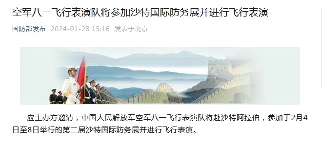 中新網(wǎng)1月28日電 據(jù)國防部官方微信消息,應主辦方邀請,中國人民解放軍空軍八一飛行表演隊將赴沙特阿拉伯,參加于2月4日至8日舉行的第二屆沙特國際防務展并進行飛行表演。