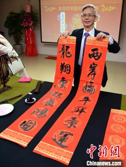 1月28日,兩岸藝術(shù)家春聯(lián)展在臺(tái)北江山如此多嬌藝術(shù)館舉行。圖為臺(tái)灣中華書道學(xué)會(huì)理事長(zhǎng)楊旭堂當(dāng)場(chǎng)揮毫?xí)鴮憽皟砂逗推介_景運(yùn),龍翔云起展鴻圖”。中新網(wǎng)記者 路梅 攝