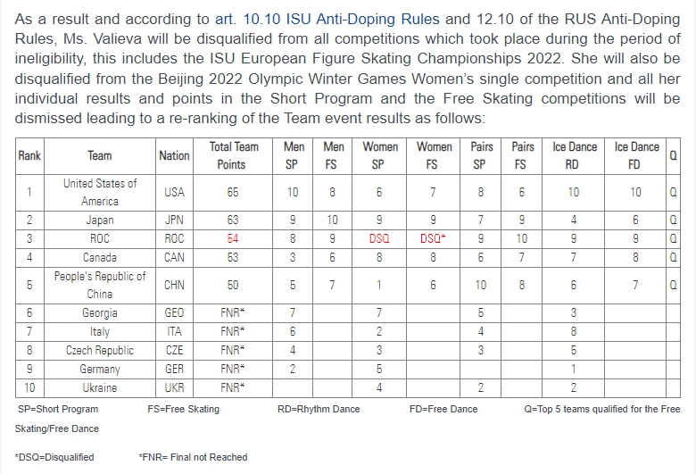 當(dāng)?shù)貢r(shí)間30日,國際滑聯(lián)對北京冬奧會(huì)花樣滑冰團(tuán)體成績進(jìn)行了重新計(jì)算,瓦利耶娃所獲得的成績積分被取消,俄羅斯奧委會(huì)代表團(tuán)在花樣滑冰團(tuán)體項(xiàng)目中的金牌變?yōu)殂~牌。