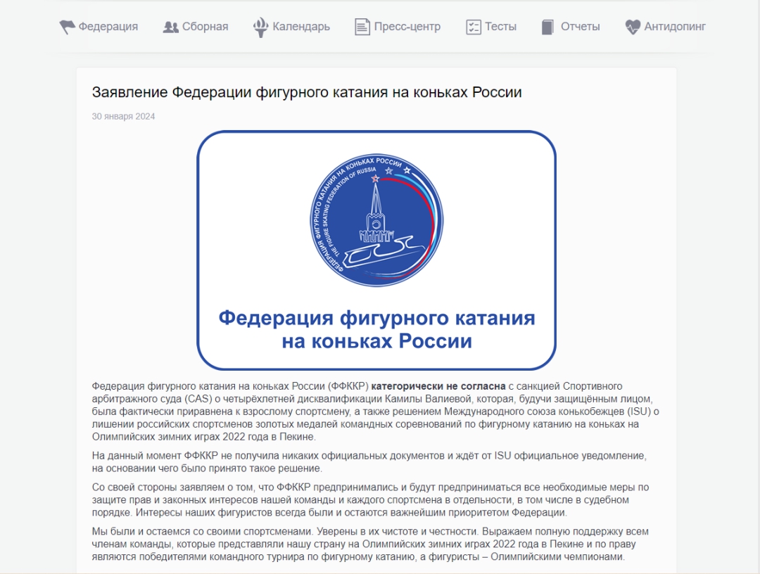 當(dāng)?shù)貢r(shí)間1月30日,俄羅斯花樣滑冰聯(lián)合會(huì)(FFKKR)發(fā)布聲明表示,團(tuán)隊(duì)中運(yùn)動(dòng)員的誠信無可挑剔,“堅(jiān)決不同意國際體育仲裁法庭對卡米拉·瓦利耶娃的處罰”。