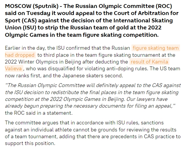 據(jù)俄羅斯衛(wèi)星通訊社報(bào)道,俄羅斯奧委會(huì)也在當(dāng)?shù)貢r(shí)間30日表示,將針對俄羅斯花滑運(yùn)動(dòng)員卡米拉·瓦利耶娃被處以禁賽并取消北京冬奧會(huì)俄羅斯奧委會(huì)代表團(tuán)花滑團(tuán)體金牌一事,向國際體育仲裁法庭提起上訴。