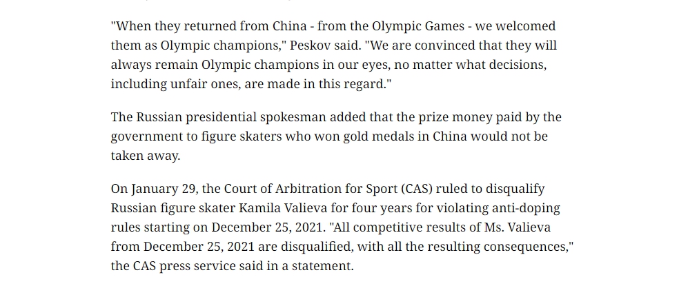 據(jù)塔斯社報(bào)道,佩斯科夫表示,無論國際體育組織作出什么決定,俄羅斯人會(huì)永遠(yuǎn)將卡米拉·瓦利耶娃和其他花樣滑冰運(yùn)動(dòng)員視為冬奧冠軍。