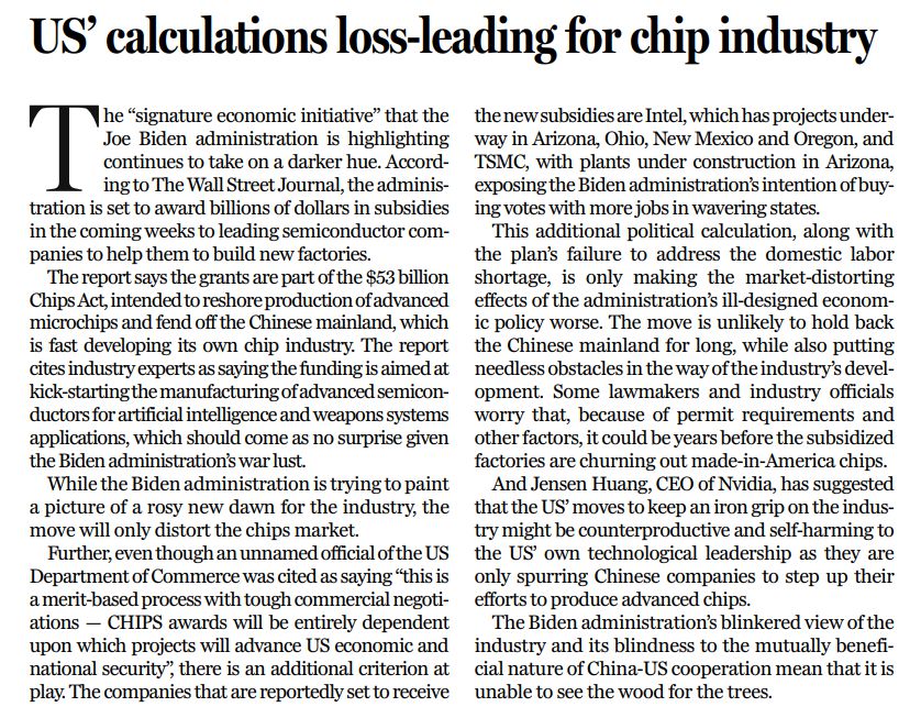 美國(guó)失策的經(jīng)濟(jì)政策本已造成市場(chǎng)扭曲,疊加出于政治意圖的算計(jì),以及補(bǔ)貼也無(wú)法解決的勞動(dòng)力短缺問題,這一切只會(huì)讓扭曲態(tài)勢(shì)進(jìn)一步惡化。此舉不太可能長(zhǎng)期遏制中國(guó)大陸,但卻給行業(yè)發(fā)展帶來(lái)種種不必要的障礙。美國(guó)部分國(guó)會(huì)議員及企業(yè)高管擔(dān)心,受到許可要求及其他因素影響,享受補(bǔ)貼的企業(yè)可能要花費(fèi)很多年才能生產(chǎn)出美國(guó)制造的芯片。