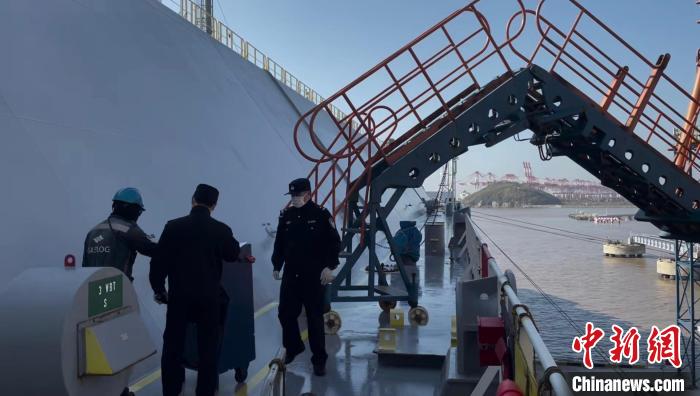 洋山邊檢站民警登輪對液化天然氣運(yùn)輸船實(shí)施入境核查。(李娜 攝)