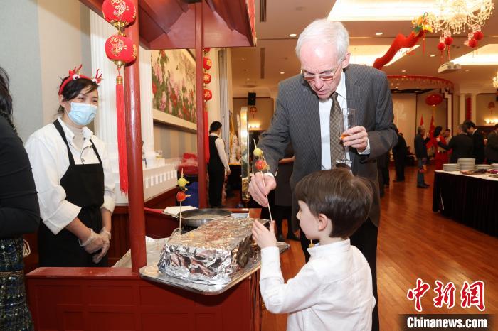 當(dāng)?shù)貢r(shí)間2月1日晚,加拿大首都渥太華,中國(guó)駐加拿大大使館舉行2024年春節(jié)招待會(huì)。圖為現(xiàn)場(chǎng)制作的中國(guó)風(fēng)味小吃冰糖葫蘆吸引來(lái)賓品嘗。中新網(wǎng)記者 余瑞冬 攝