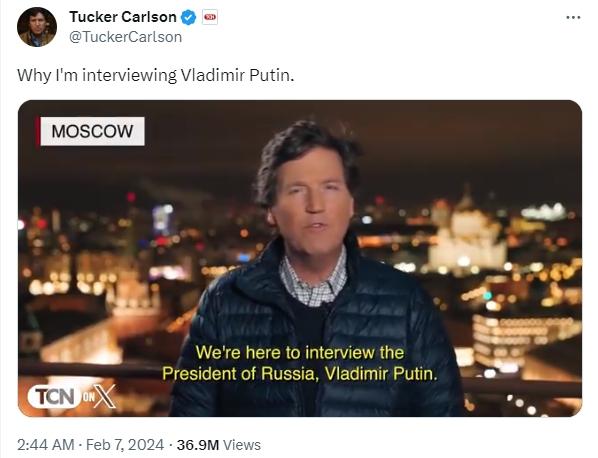 據(jù)介紹,卡爾森是??怂闺娨暸_的一名當(dāng)紅主播,主要負(fù)責(zé)一檔名為《卡爾森今夜秀》的新聞節(jié)目。他在2023年4月被福克斯解雇,隨后在社交平臺X上繼續(xù)發(fā)布采訪節(jié)目。路透社稱,卡爾森2023年8月在X上發(fā)布的對美國前總統(tǒng)特朗普的采訪獲得了上億播放量。