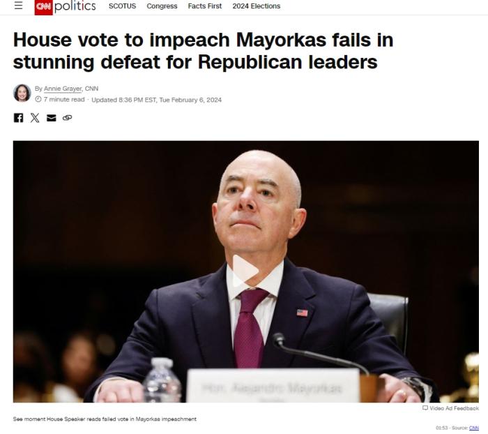 美國(guó)眾議院未通過(guò)對(duì)國(guó)土安全部長(zhǎng)的彈劾案