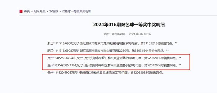 記者致電貴州省福利彩票發(fā)行中心,相關(guān)工作人員表示,在貴州的134注一等獎(jiǎng)中,133注為同一銷售網(wǎng)點(diǎn)銷售,由兩張彩票組成。銷售網(wǎng)點(diǎn)的地址為貴州安順市平壩區(qū)黎平大道堡墅小區(qū)8號門面,編號為第52032056號。