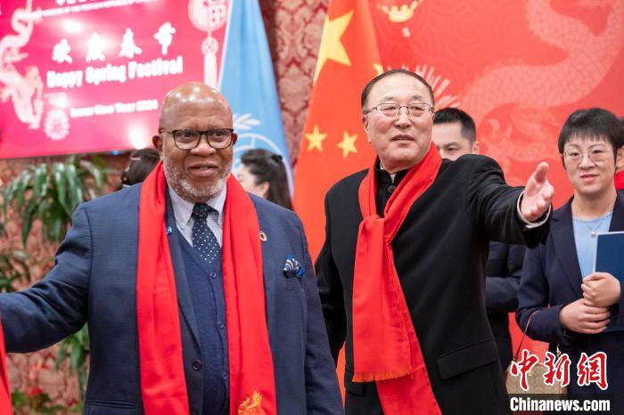 當(dāng)晚,中國常駐聯(lián)合國代表團(tuán)在紐約駐地舉行龍年新春招待會(huì)。
