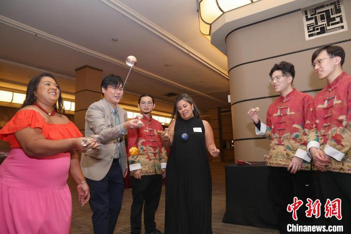 2月8日,曾在香港和國(guó)際賽事中屢獲殊榮的香港劍球(亦稱(chēng)劍玉)隊(duì)成員(著唐裝者)獲香港駐多倫多經(jīng)貿(mào)處邀請(qǐng)?jiān)L加并出席新春酒會(huì)時(shí),指導(dǎo)與會(huì)嘉賓體驗(yàn)劍球。 中新社記者 余瑞冬 攝