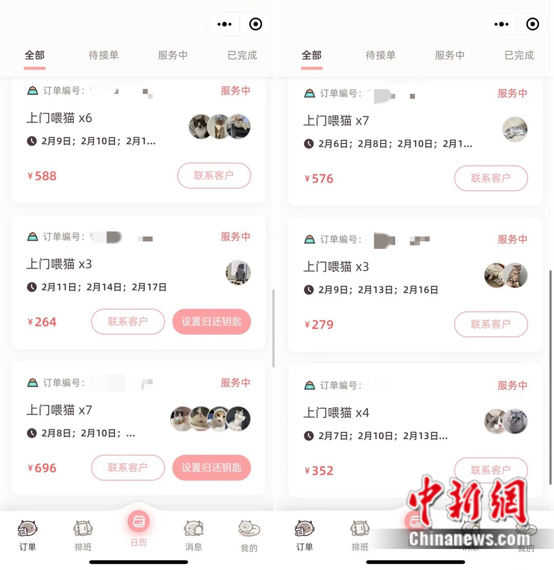 早在兩個(gè)月前,池女士就陸續(xù)接到了預(yù)約春節(jié)上門(mén)喂養(yǎng)的單子,到了1月底,由于訂單眾多,她不得不封單?!鞍创螖?shù)的話有超過(guò)150單了,好幾天都是一天20單?!卑垂?jié)假日平均80/次的價(jià)格來(lái)算,這個(gè)春節(jié)她將收入過(guò)萬(wàn)。