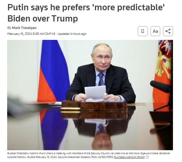 據(jù)報(bào)道,這是普京首次公開評(píng)論2024年美國大選。當(dāng)被問及兩人誰當(dāng)選對(duì)俄羅斯“更有利”時(shí),普京回應(yīng):“拜登,他更有經(jīng)驗(yàn)、更有預(yù)見性,是一位老派政治家?!?/p>