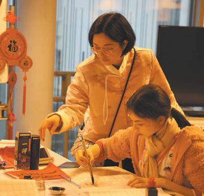 2月3日,在法國巴黎中國文化中心“走進(jìn)中心過大年”活動中,學(xué)員體驗中國書法。