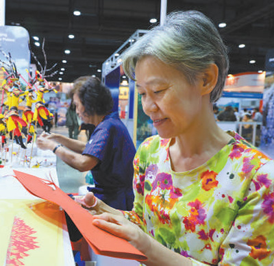1月25日,在泰國國際旅游展上,參觀者體驗中國剪紙。