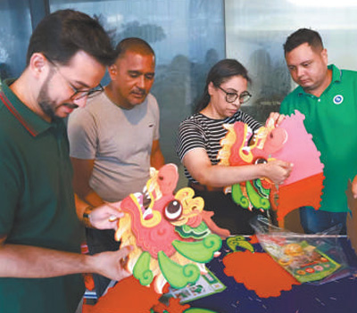 2月3日,巴西民眾在累西腓春節(jié)廟會活動現(xiàn)場體驗制作手工龍頭。