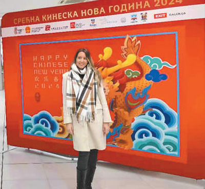 1月30日,在塞爾維亞諾維薩德,一位女士在“歡樂春節(jié)”活動展板前留影。